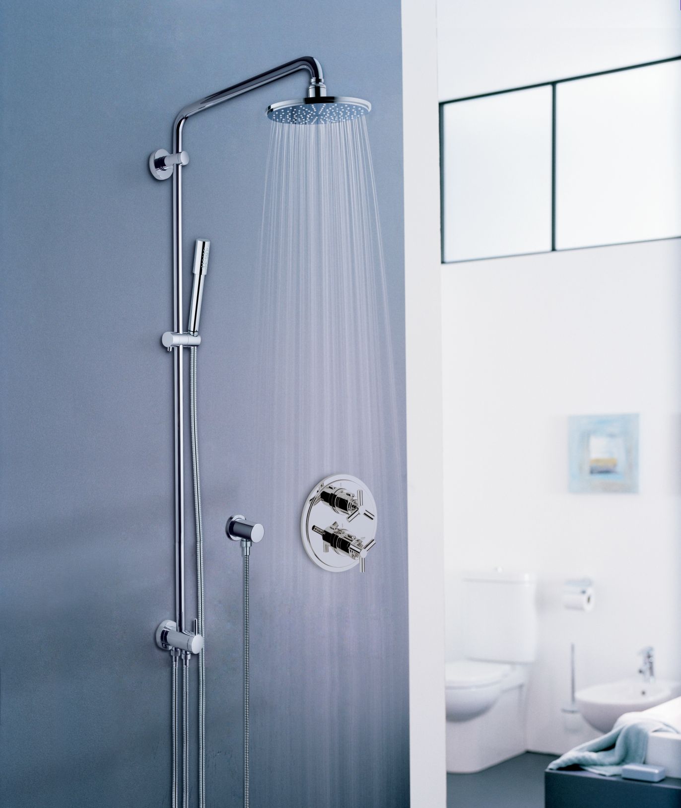 既存の混合水栓を撤去することなく、ウォールバーの取り替えと同程度の手軽さで流行のオーバーヘッドシャワーシステムを導入できます。また、混合水栓は、埋込み・露出タイプどちらにも対応可能です。バススパウト付きの水栓を採用することで、洗い場・オーバーヘッドシャワー・ハンドシャワーの切り替えが可能になり、日本の浴室スタイルにも馴染みます。