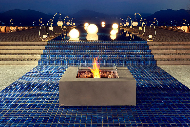 ベースは2mの正方形の整然としたデザインのアウトドアファイヤープレースです。多機能なテーブルと暖炉の機能を兼ね備え、最大限に暖炉の楽しみを堪能いただけます。ガーデン・テラスの主役として機能します。
