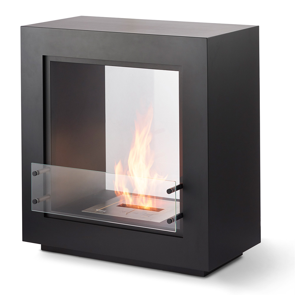 基本的に長方形であるため、幅広い用途に使うことができます。スタイリッシュなデザインの自立式の家具型暖炉の内部に、EcoSmartバーナーが収められるようになっています。後面には強化ガラス製パネル、前面には固定式風よけスクリーンが取り付けられています。