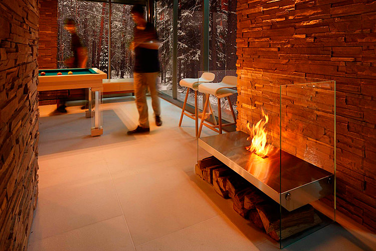 ステンレススティール製のベンチは、まるで浮いているように周囲のガラスに取り付けられています。ガラスパネルによって炎がさまざまな方向に反射し、炎が「踊っている」ように見えます。息をのむほど美しいセンターピースとして、独特な雰囲気と暖かさを生み出します。