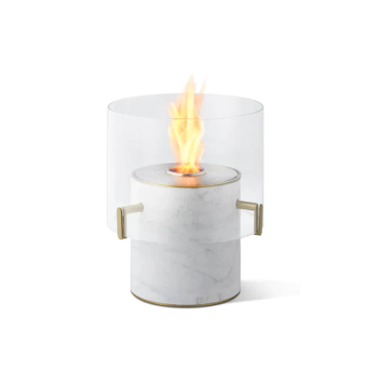 炎を囲む耐熱性の高いガラススクリーンを支えるアームとベースのリムには、木と大理石とも相性がよい真鍮がアクセントとなっています。