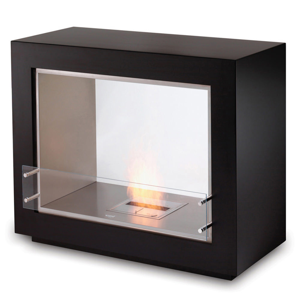 長方形の自立式二面開口型暖炉で、すっきりとしたモダンなラインが特徴です。後面には強化ガラスを使用し耐久性を高めています。
