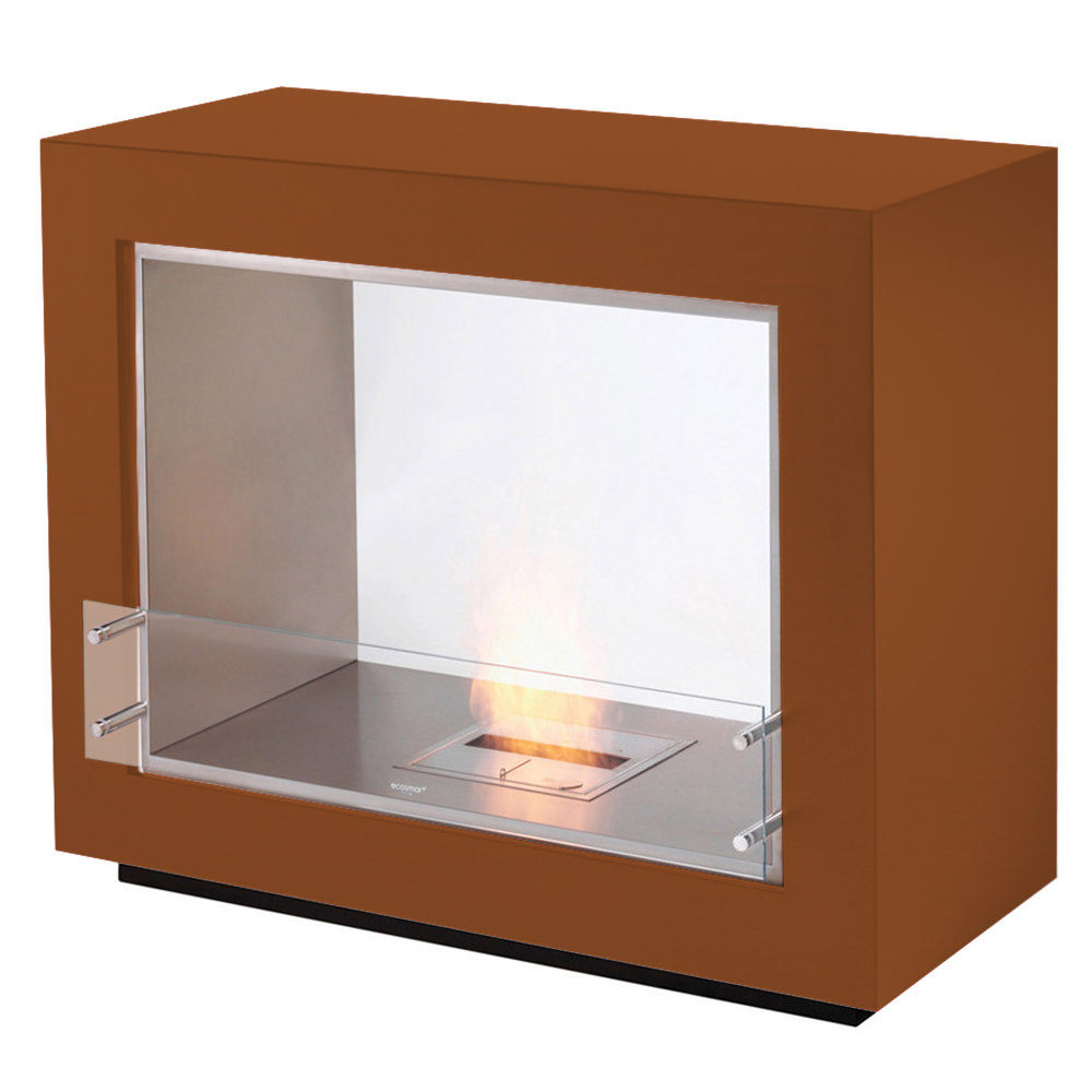 長方形の自立式二面開口型暖炉で、すっきりとしたモダンなラインが特徴です。後面には強化ガラスを使用し耐久性を高めています。