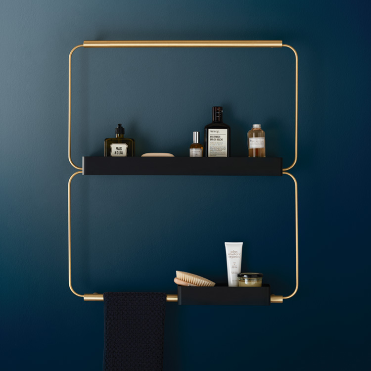 ヌードはスペインのデザイナーMUTによって設計されたアクセサリーシステムです。ブラックとブラスのグリッドに、ミラーやコンテナと呼ばれるシェルフを組み合わせることで、機能的な仕切りパネルやシェルフシステムに変わります。シーンは自由、化粧鏡として、タオルレールとして、収納として、水まわりにもリビングスペースにもマッチします。