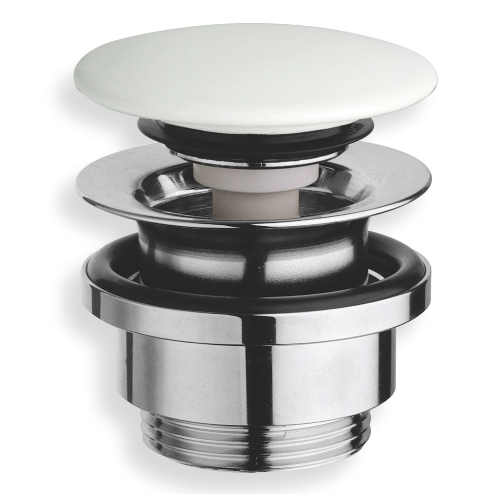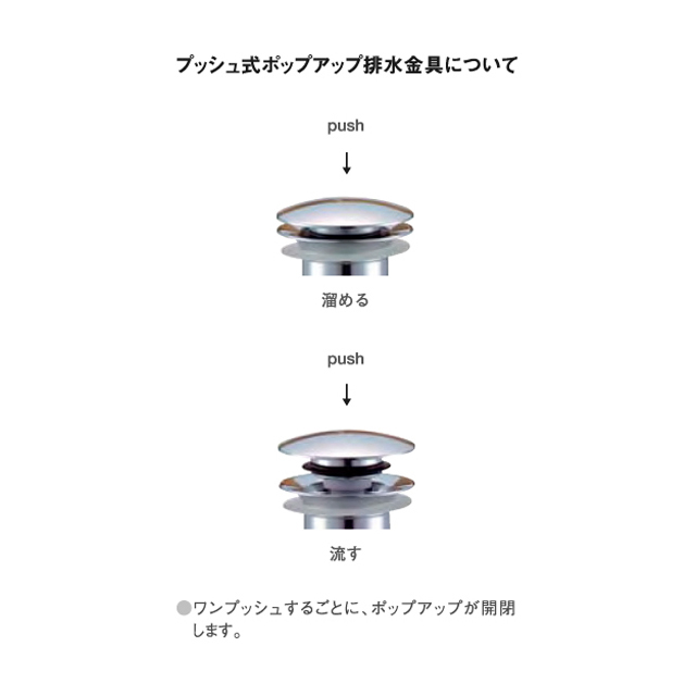 上部のカバーを直接押すことで栓が開閉して水を流したり貯めたりができるプッシュタイプ。水栓金具と連結する必要がないため、水栓の種類に関係なく自由に組み合わせることができ、メンテナンスも簡単。開閉操作がシンク内で済むため、キャビネットなどで洗面器下のスペースが隠れるようなプランでもお使いいただける排水金具です。