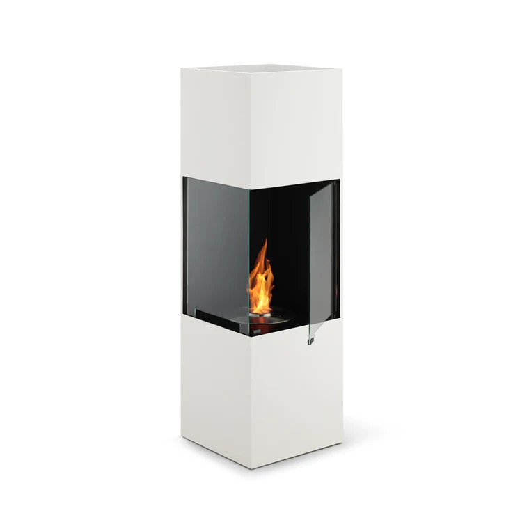 2面の開口部をガラスで覆い、半密閉状態を作っています。これにより火室内の炎に触れる心配がなく、より安心してご使用いただけます。 暖炉上部に設けた煙突状の開口により、暖気が室内に循環します。空間のコーナー部分に設置した際、どの位置からも炎が美しく見えるよう2面にガラスを設けたデザインにしています。火室内は炎が美しく魅せるためのBlackで統一、外側はblackまたはwhiteをインテリアに合わせて選択いただけます。