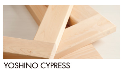 シンプルにして圧倒的な存在感を放つ桧の框。まわりの芳しい香りが漂い、気分はまさに森林浴。