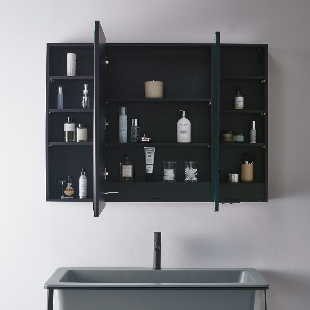 | 商品仕様 | ミラー:5mm厚(防湿加工)・上下ステンレスフレーム F☆☆☆☆対応 設置方法:壁付け(ドッコ&壁面固定用タッピンねじ同梱) 可動棚:左棚3段、中央3段、右棚3段 扉開き:左扉:85°右開き、中央扉:155°左開き、右扉:85°左開き 右底面にコンセント2口(合計1200Wまで) 右底面にLEDライトと曇り止めヒーター連動のON/OFFスイッチ1個(曇り止めヒーターはセンターミラーのみ) 消費電力:LED:10.36W×2本=20.72W ヒーター:6W 合計:26.72W 定格光束:1258lm(629lm/LED1本×2本) 固有エネルギー消費効率47.1lm/W |