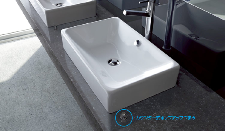 引き棒のある水栓金具にはポップアップ排水金具を組み合わせます。