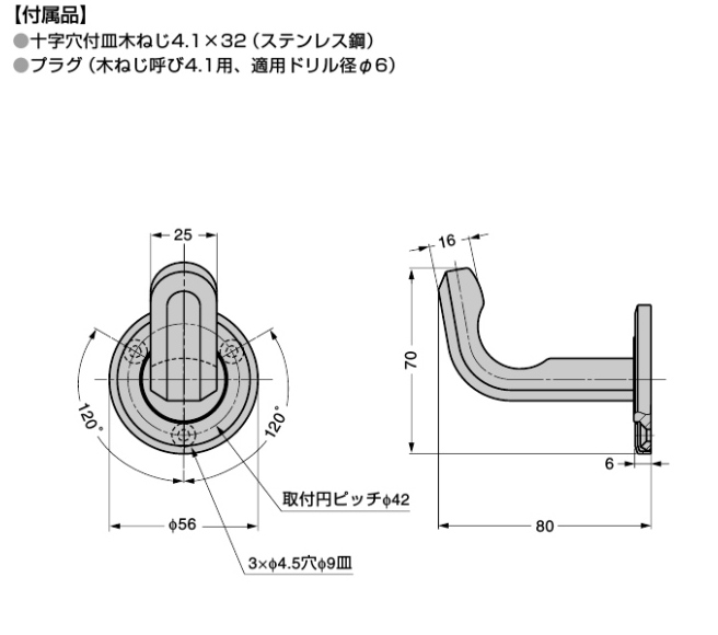 | 商品仕様 | 十字穴付皿木ねじ4.1×32(ステンレス鋼)、プラグ(木ねじ呼び4.1用、適用ドリル径φ6)付属 耐荷重:37kgf |