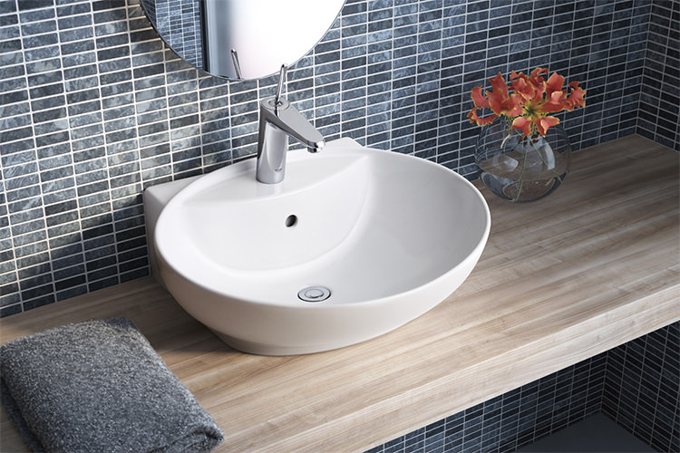 前下がりの形状空間を広く感じさせる洗面ボウルです。ボウル底面に立ち上がりがあるため、清掃性にも優れています。
