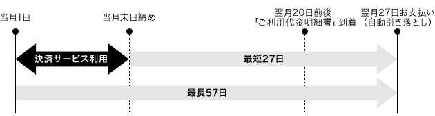 締切日(毎月末日)の翌月27日にお支払いいただく方法です。 ※日数は曜日等により変動いたします。