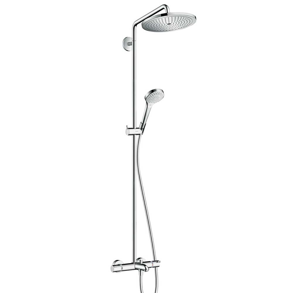 クロマセレクトS280シャワーパイプは、口径280mmの大きなエア入りオーバーヘッドシャワーと、3段階切り替え可能なクロマセレクト110ハンドシャワーに、エコスタット・サーモスタットバス・シャワー混合水栓がオールインワンになったシャワーシステムです。