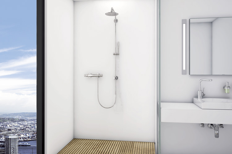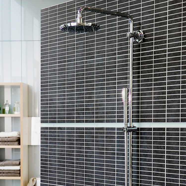 既存の混合水栓を撤去することなく、ウォールバーの取り替えと同程度の手軽さで流行のオーバーヘッドシャワーシステムを導入できます。また、混合水栓は、埋込み・露出タイプどちらにも対応可能です。バススパウト付きの水栓を採用することで、洗い場・オーバーヘッドシャワー・ハンドシャワーの切り替えが可能になり、日本の浴室スタイルにも馴染みます。
