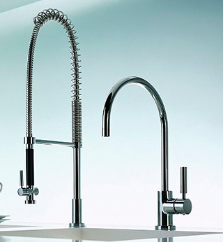 1998 年には、それまで培ったバスルーム金具のノウハウを活かし、キッチンのフィールドに進出。デザインと機能性が見事に融合したキッチン水栓を発表し、多くの高級キッチンメーカーに採用されました。 スプリング式のスプレーヘッドや、大きくアーチを描くスパウトの美しいラインなど、ドンブラハのトレードマークとも言えるデザインは、日本でも高い人気を誇ります。 デザインと機能・耐久性の融合というテーマが完成形となります。