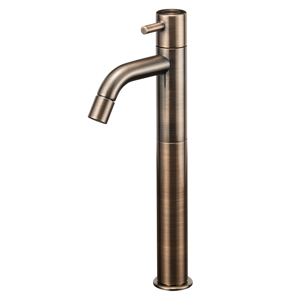 細くスッキリとしたデザインの単水栓。小型の置き型手洗器との相性は抜群。カラフルな水栓は、あなただけの個性的な水まわりを演出します。