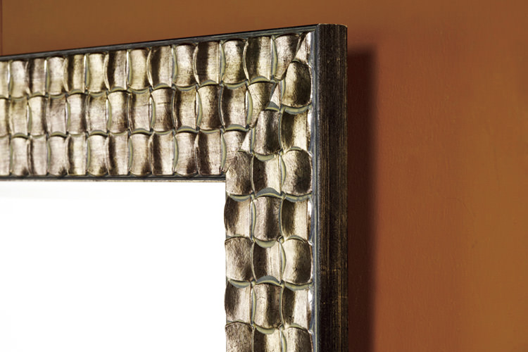 | 商品仕様 | ミラー取付方法についてはこちらをご参照ください フレーム巾80mm 木製(アンティークシルバー) ミラー面取り 圧着施工可(仕様変更有料) 吊り |
