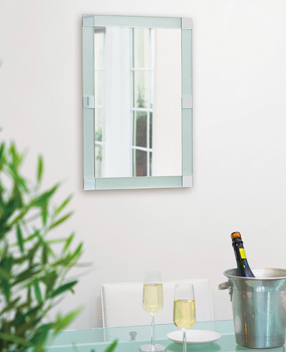 | 商品仕様 | ミラー取付方法についてはこちらをご参照ください クリアミラー + デザインガラス貼り合わせ(巾40mm) 吊り 圧着施工可 日本製 |