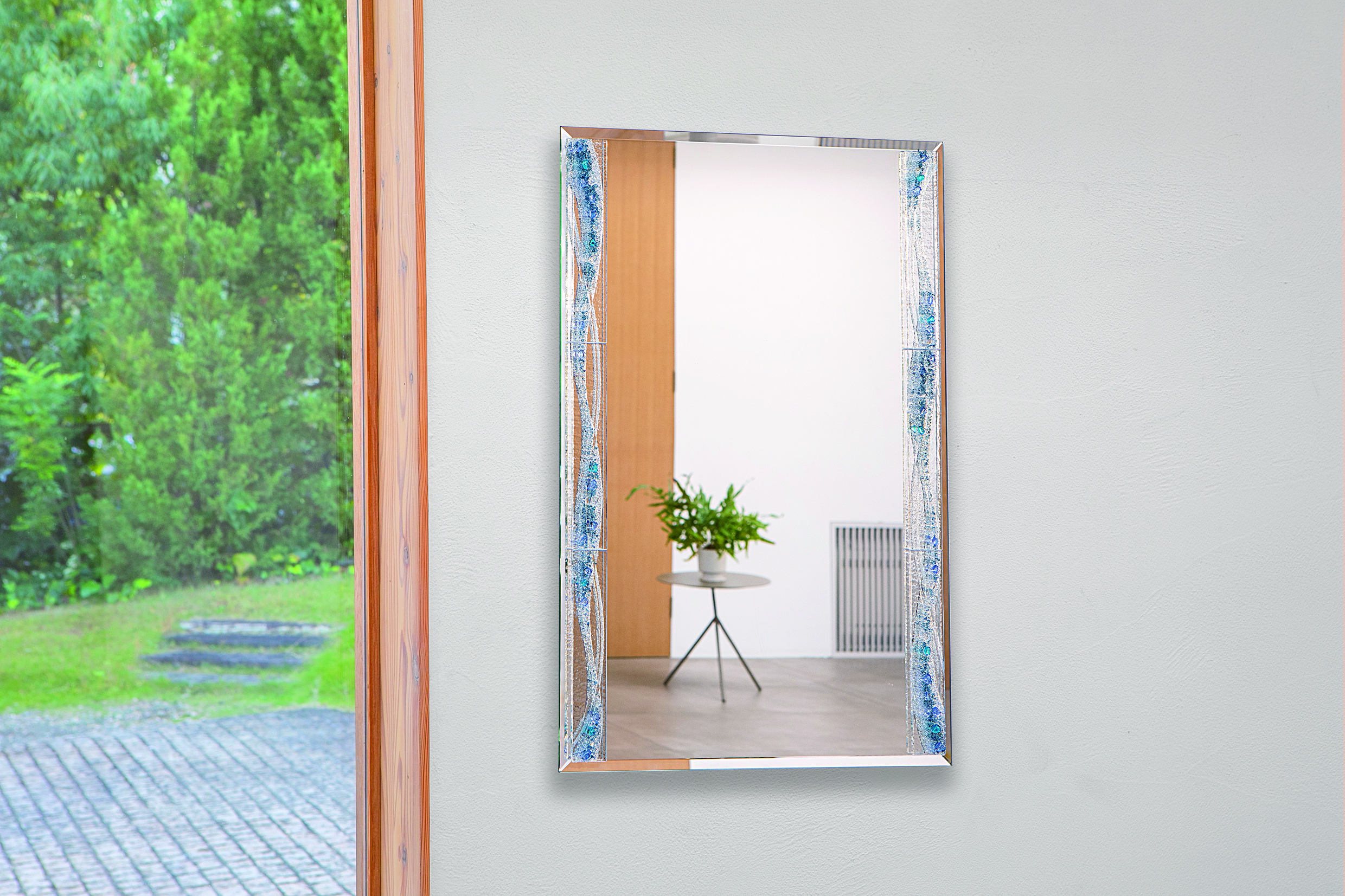 | 商品仕様 | ミラー取付方法についてはこちらをご参照ください フュージングガラス(ブルー)/エッチングライン 裏板9mm 吊り 圧着施工可 日本製 |