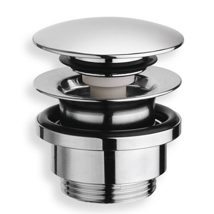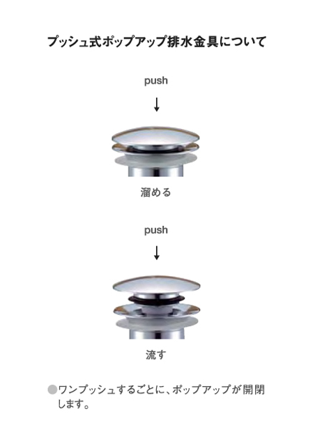 上部のカバーを直接押すことで栓が開閉して水を流したり貯めたりができるプッシュタイプ。水栓金具と連結する必要がないため、水栓の種類に関係なく自由に組み合わせることができ、メンテナンスも簡単。開閉操作がシンク内で済むため、キャビネットなどで洗面器下のスペースが隠れるようなプランでもお使いいただける排水金具です。