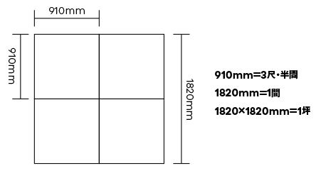 3尺=910mmの1マスを1つの単位として、1間=1820mmという単位をよく使用します。1820mm×1820mmが1坪となります。