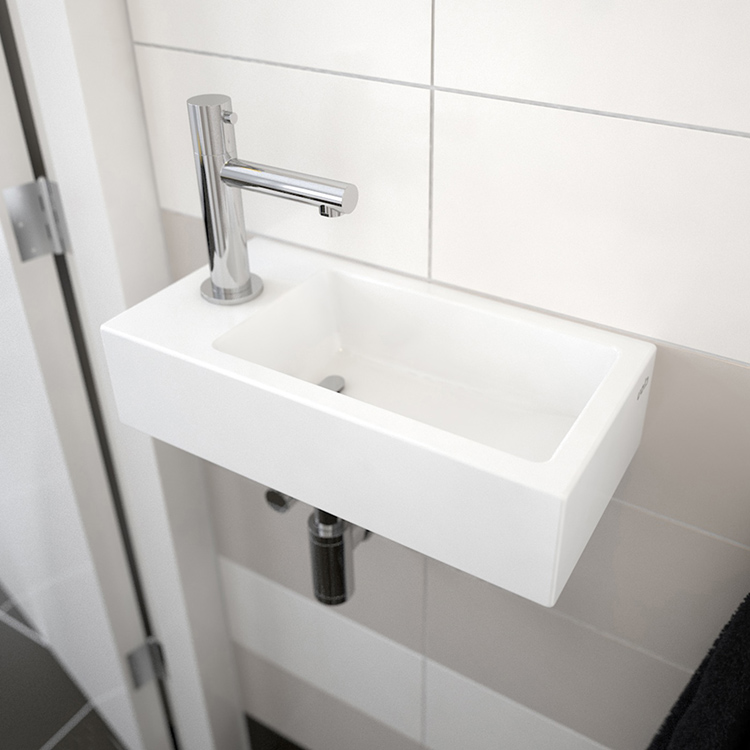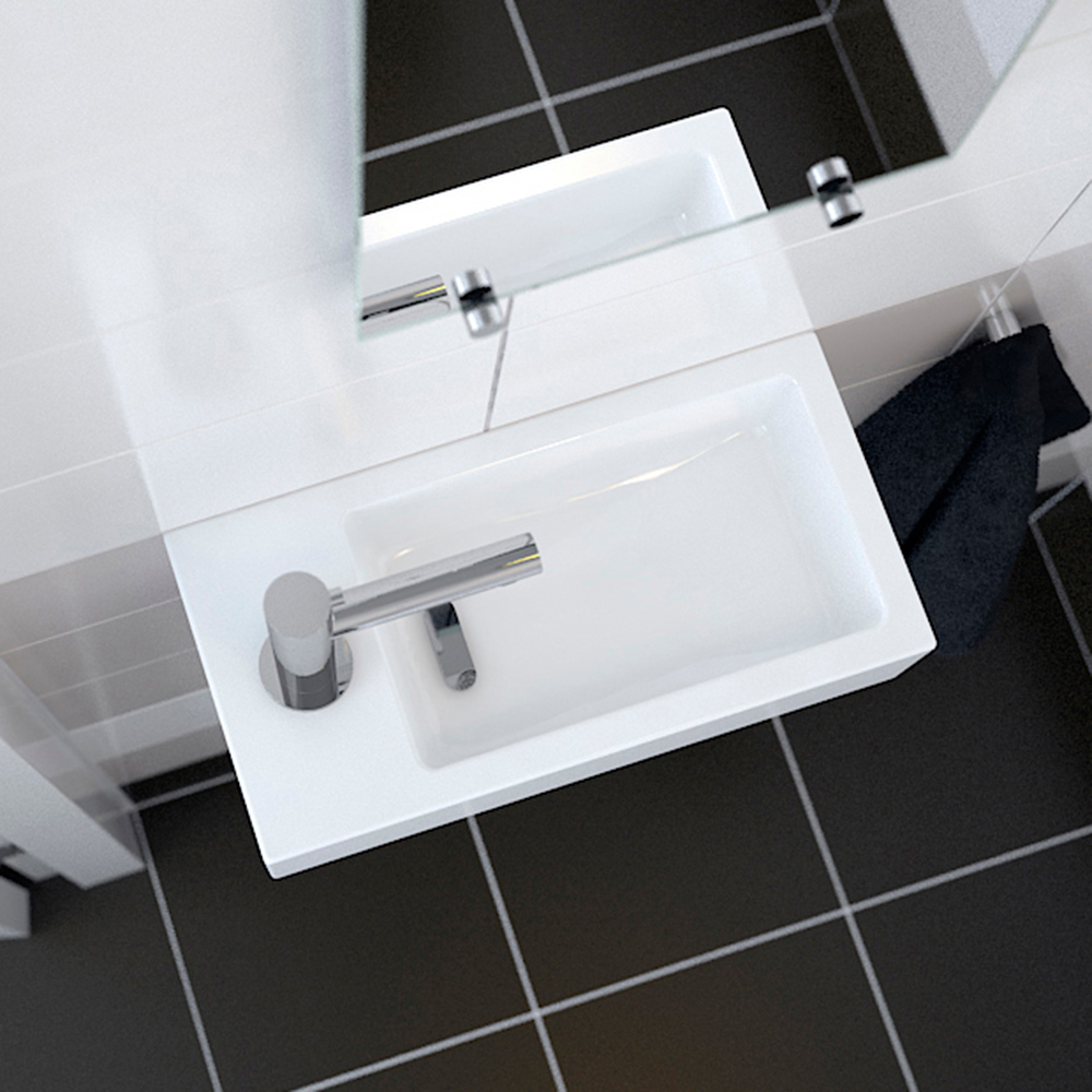 奥行き18センチのサイズは、スペースのとれないトイレ空間への設置にお勧めです。また、スクエアのニュートラルなデザインですので、住宅やマンション、店舗など、場所を選ばず様々な空間にフィットします。水はねが気になる場合にも、止水栓(壁給水/床給水タイプがございます。施工現場に合わせてお選びください)で水栓の最大吐水量を絞るなど、ちょっとした工夫で軽減は可能です。コンパクトサイズのボウルにマッチした、スリムな専用の排水金具付きです。右シンクタイプとなります。