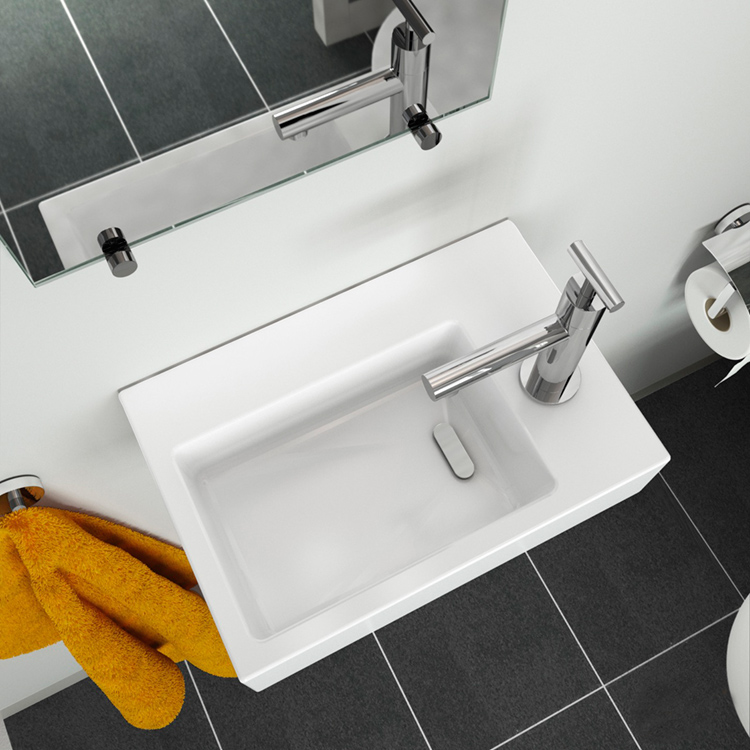 幅36センチ、奥行き24.5センチとコンパクトサイズでありながら、壁側にデッキスペースがあるので、手洗いの際、一時的に時計やアクセサリーを置いておくなどの使い方ができます。シンプルなスクエアデザインは、住宅やマンション、店舗など、場所を選ばず様々な空間にフィットします。水はねが気になる場合にも、止水栓(壁給水/床給水タイプがございます。施工現場に合わせてお選びください)で水栓の最大吐水量を絞るなど、ちょっとした工夫で軽減は可能です。スリムにデザインされた専用の排水金具付きで、設置は壁掛け、カウンター置きが可能です。