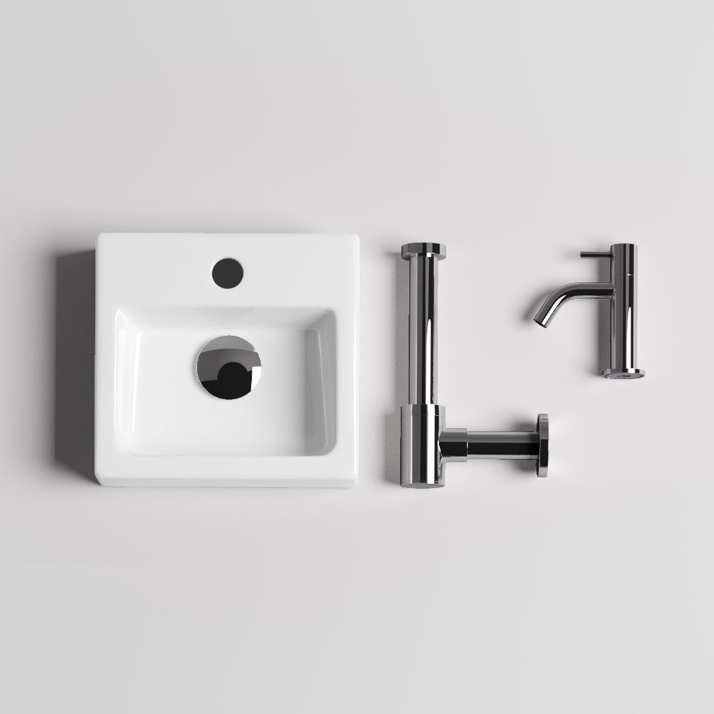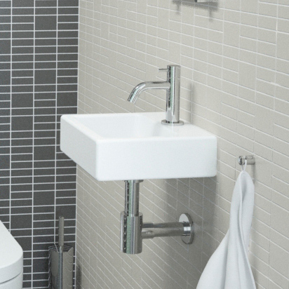 こちらの商品は、手洗器、単水栓、排水目皿、トラップ(壁用)がすべてセットになったお買い得なアイテムです。幅29センチ、奥行き27センチのコンパクトサイズで、シンプルなスクエアデザインですので、住宅やマンション、店舗など、場所を選ばず様々な空間にフィットし、設置は壁掛け、カウンター置きが可能です。水はねが気になる場合にも、止水栓(壁給水/床給水タイプがございます。施工現場に合わせてお選びください)で水栓の最大吐水量を絞るなど、ちょっとした工夫で軽減は可能です。