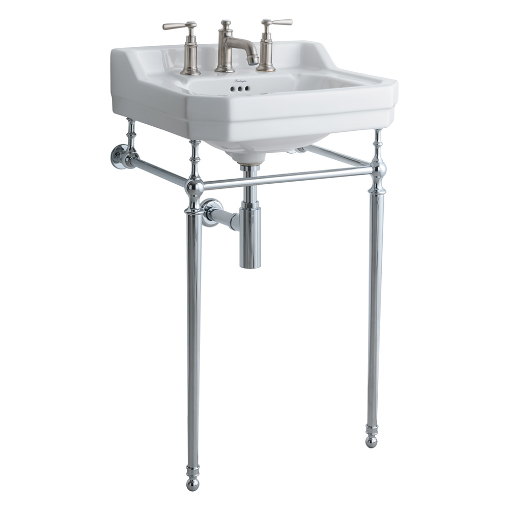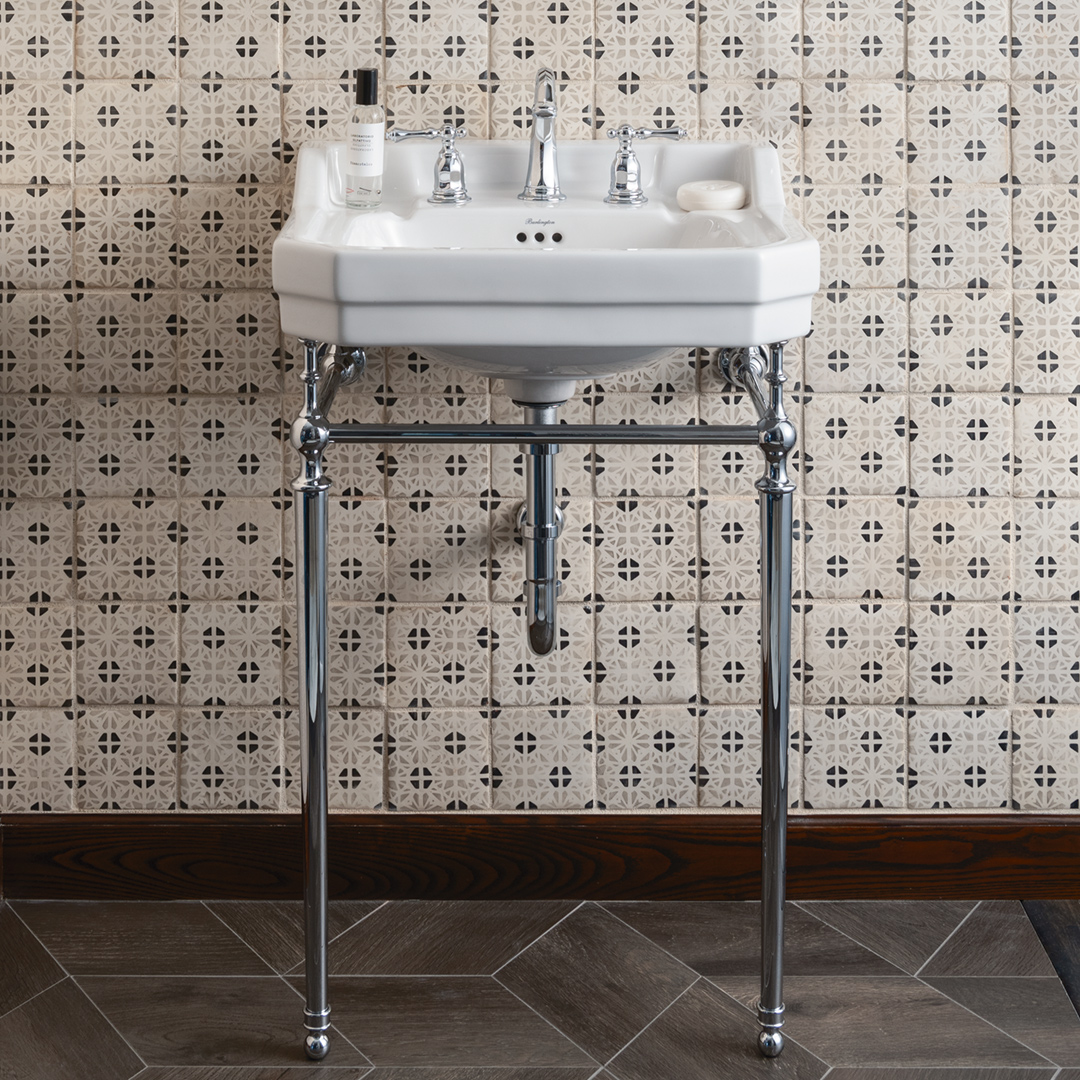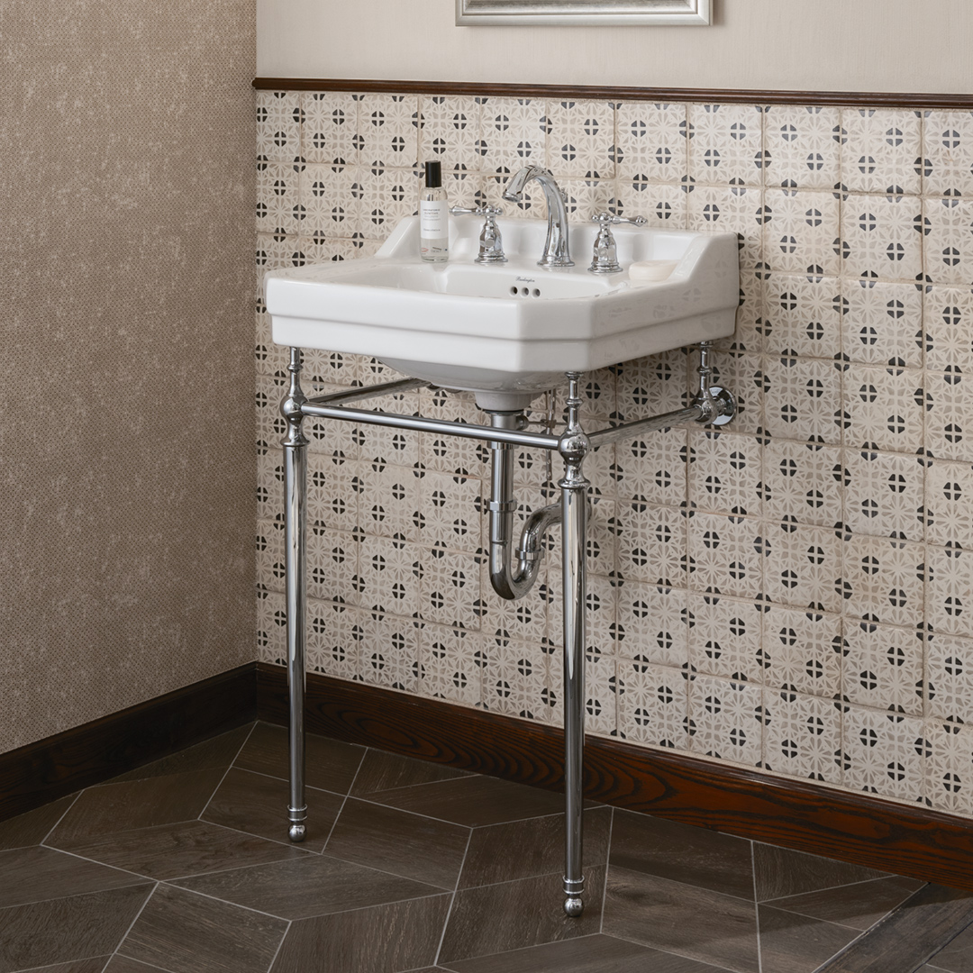 エドワーディアン洗面器は、イギリスのエドワード7世統治時代に流行した、ユニークかつ芸術的なデザインのバスルームから影響を受け、デザインされました。それまでの華美で豪華なヴィクトリアン時代とは一転し、エドワーディアンスタイルは、都会的で合理的かつ洗練されたクラシック。こちらのエドワーディアン洗面器もシンプルなラインを基調に、水跳ね防止のバックガードやソープ置きを備え、機能的なデザインです。クロムのコンソールスタンドと組み合わせれば、美しい英国様式の洗面台の完成です。スタンドを組み合わせない際は、壁掛けの洗面ボウルとしても機能します。