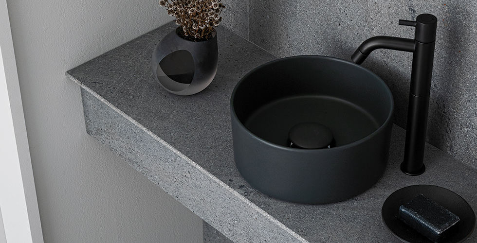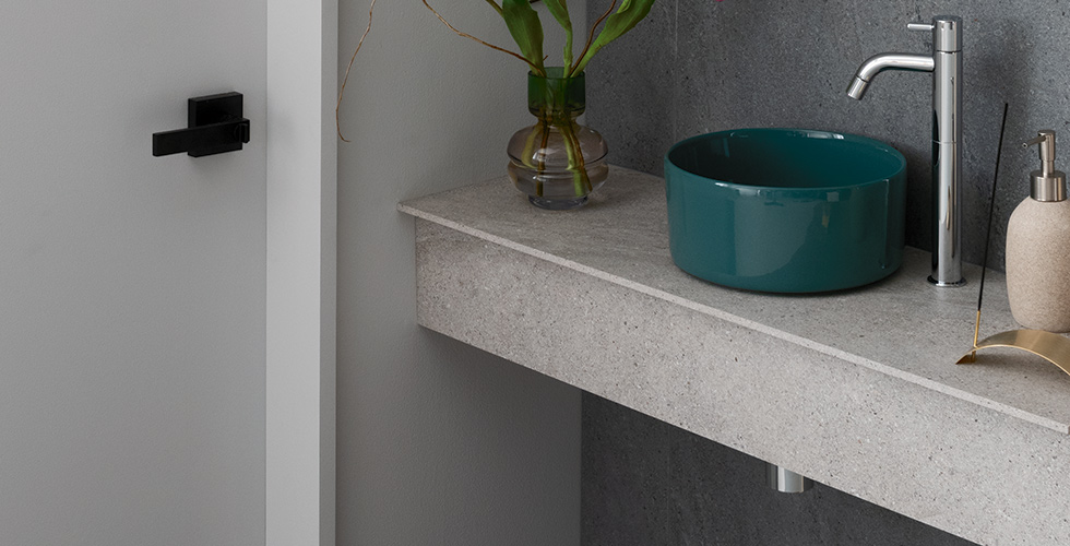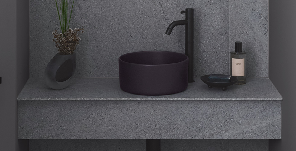 こちらの300mmというコンパクトな奥行きのセラミックタイルのカウンターは、シュイコンフォート・ミニモやプティートといった小型サイズのボウルと組み合わせてお使いいただけます。ボウルのカラーとカウンターの柄の組み合わせで、プライベートスペースをシックにもポップにも演出できます。