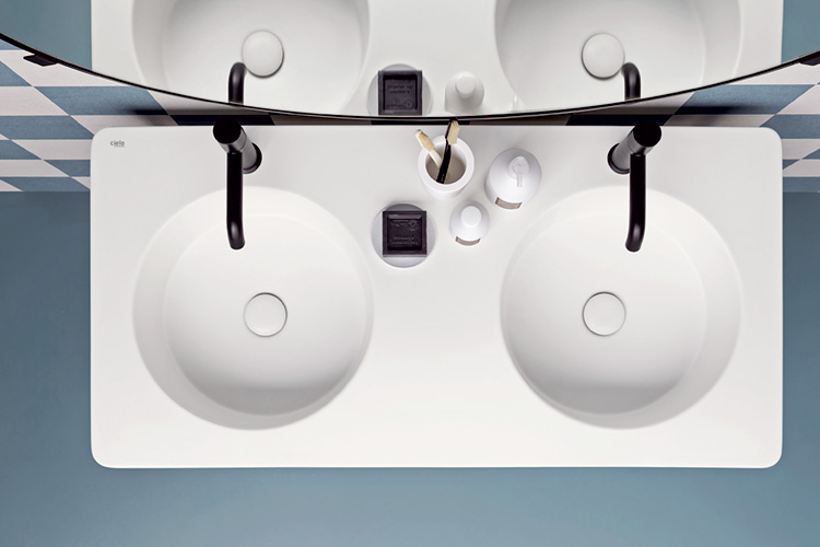 1100ミリのワイドな間口に、2つのシンクがついた洗面台です。スチールフレームにはめ込まれたセラミックのダブルボウルは家具を思わせる美しさです。セラミックと家具との融合を見事に体現し、Red Dot Design Award 2017でベストオブザベストを受賞しています。