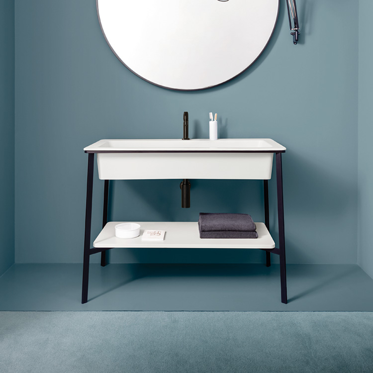 1100ミリのワイドなシングルシンクの洗面台です。スチールフレームにはめ込まれたセラミックのレクタングルボウルは優雅で贅沢な広々とした造作ながら、繊細に組み合わされた色とマテリアルに感嘆するはず。迫力のセラミックと家具との融合を見事に体現し、Red Dot Design Award 2017でベストオブザベストを受賞しています。