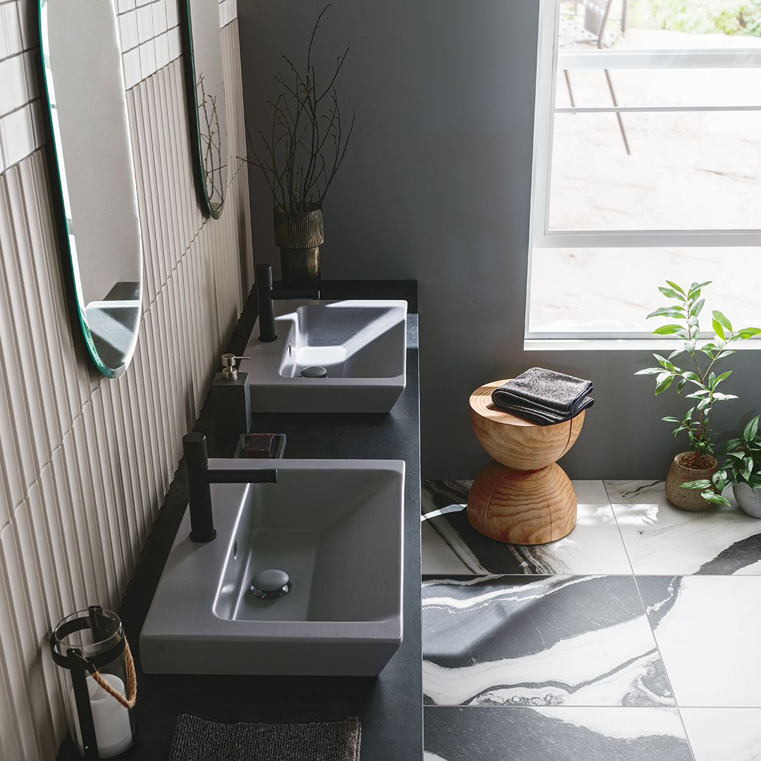エッジの効いたシンプルなフォルムが、ラグジュアリーモダンな洗面空間にフィットします。