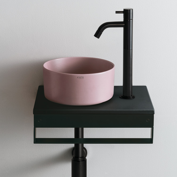 ボウルと同じセラミック素材のカウンターにブラックスティールのフレームとタオルレールが一体に。カウンターにはあらかじめ取り付け穴が開口されていますので、施工もスピーディです。