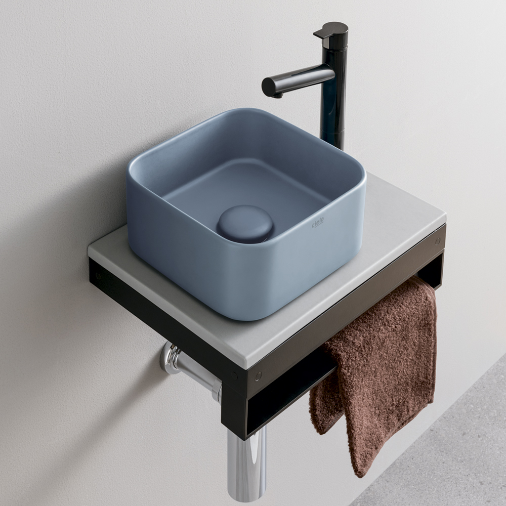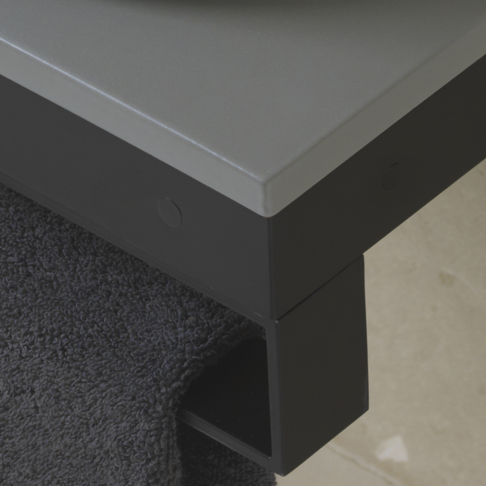 ボウルと同じセラミック素材のカウンターにブラックスティールのフレームとタオルレールが一体に。カウンターにはあらかじめ取り付け穴が開口されていますので、施工もスピーディです。
