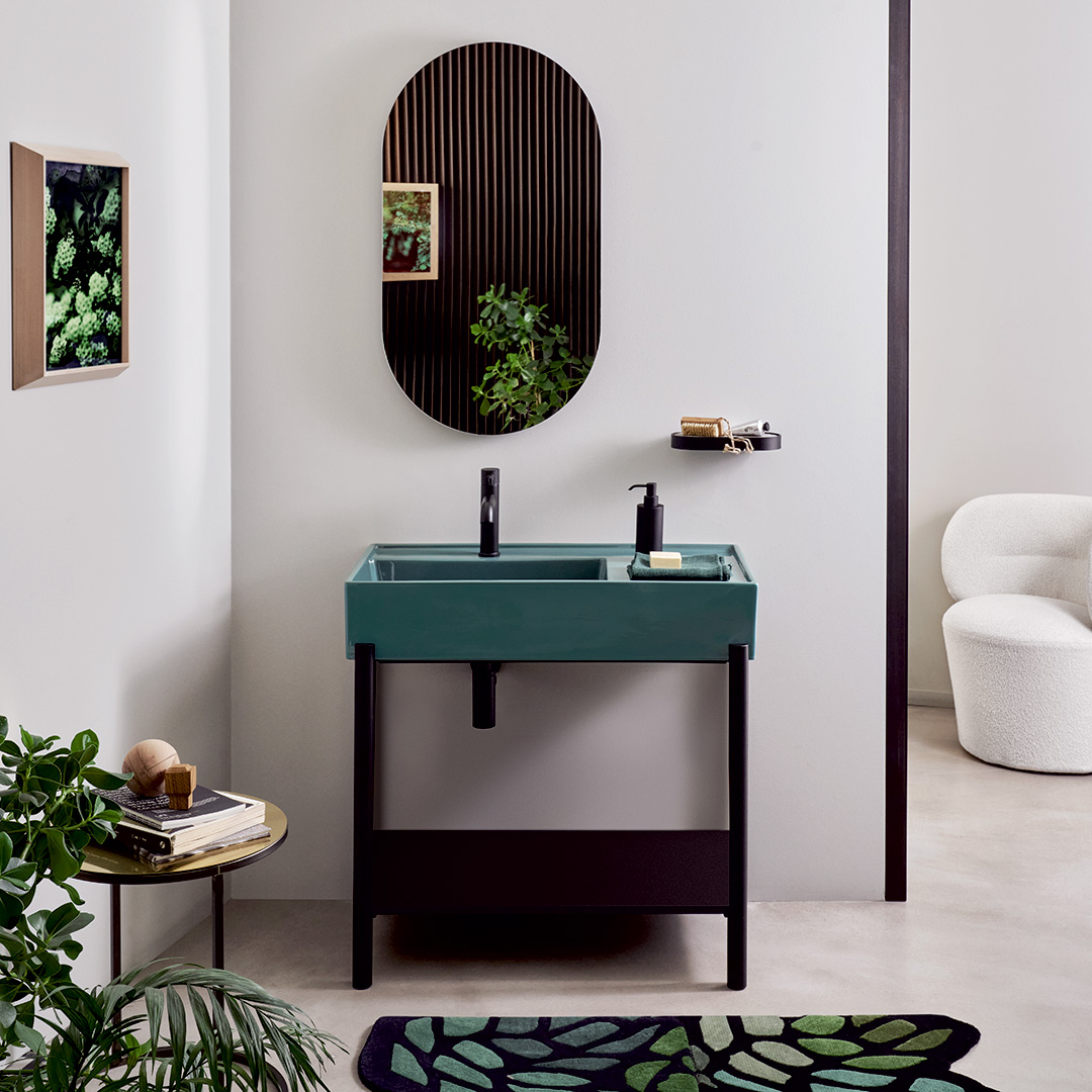 プリニオは、迫力の850mmのセラミックシンクと、フレーム・ボトムシェルフをコンビネーションしたコンポーネントタイプ洗面台です。