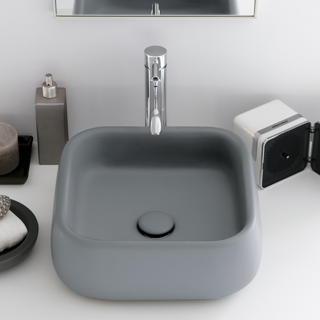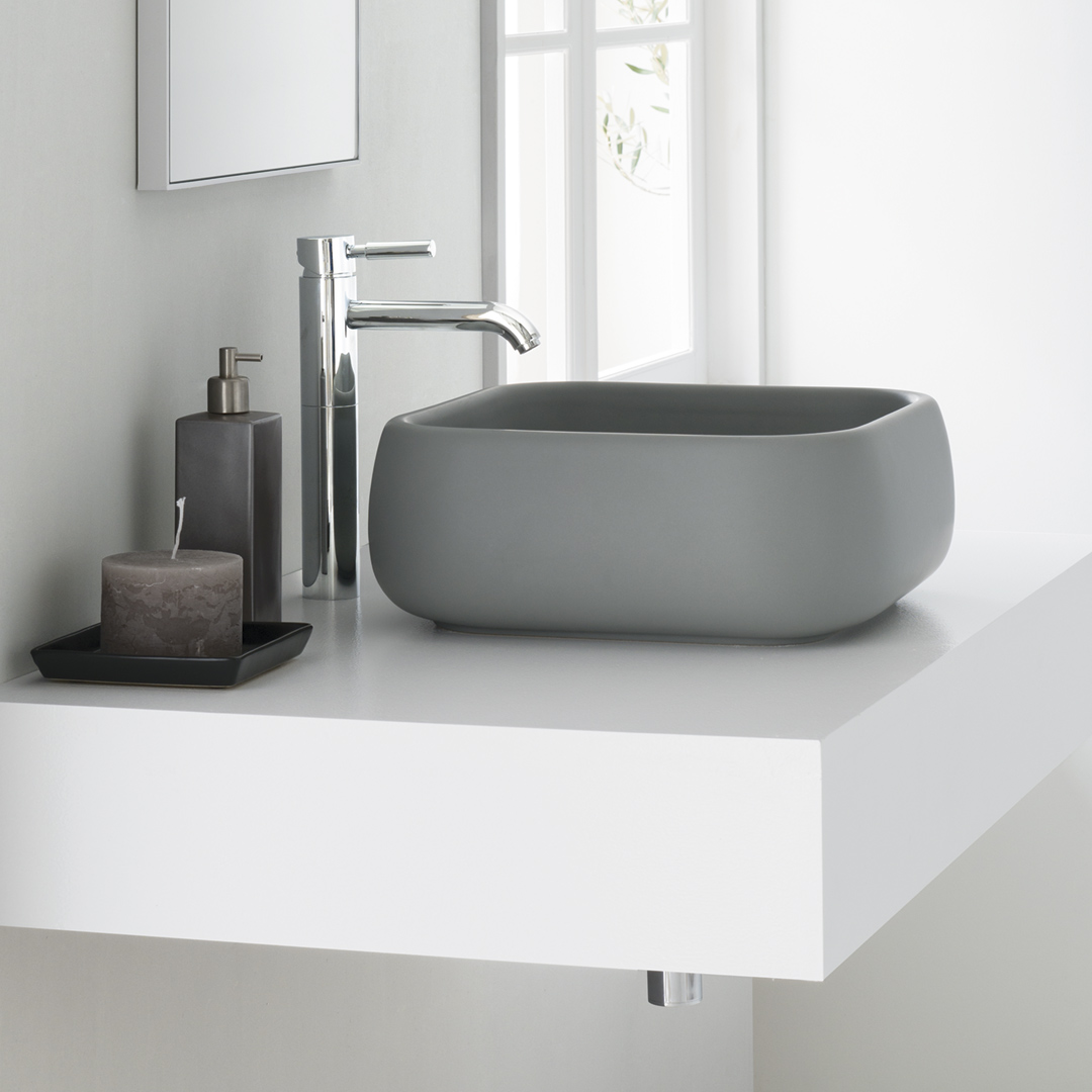 こちらは丸みを帯びた正方形フォルムのSHUI。小ぶりな400mmサイズは店舗スペースや、ゲスト用の手洗器に。