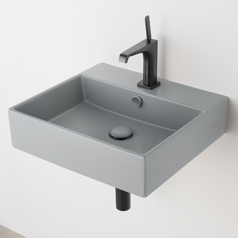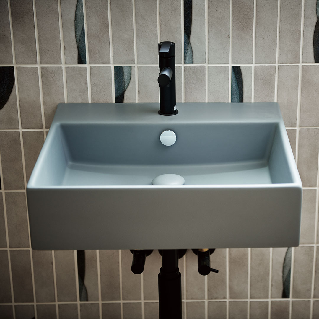 スマイル50は、日本の洗面所にちょうど良い間口500mmのスクエアボウルです。間口400mmでは小さい・600mmでは少し大きいという日本の集合住宅やホテルなどにも最適。カウンター置き・壁付け両方に対応していますので、シンプルなフォルムと相まって、設置場所・テイストを選ばない洗面ボウルです。