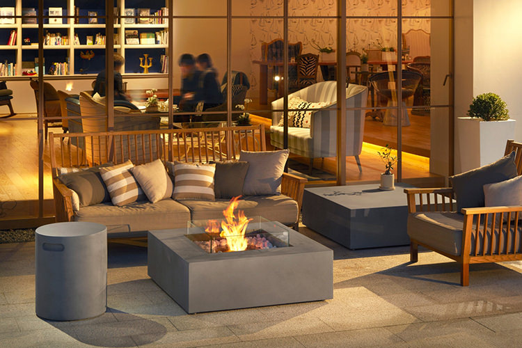 ベースは3mの正方形の整然としたデザインのアウトドアファイヤープレースです。多機能なテーブルと暖炉の機能を兼ね備え、最大限に暖炉の楽しみを堪能いただけます。ガーデン・テラスの主役として機能します。