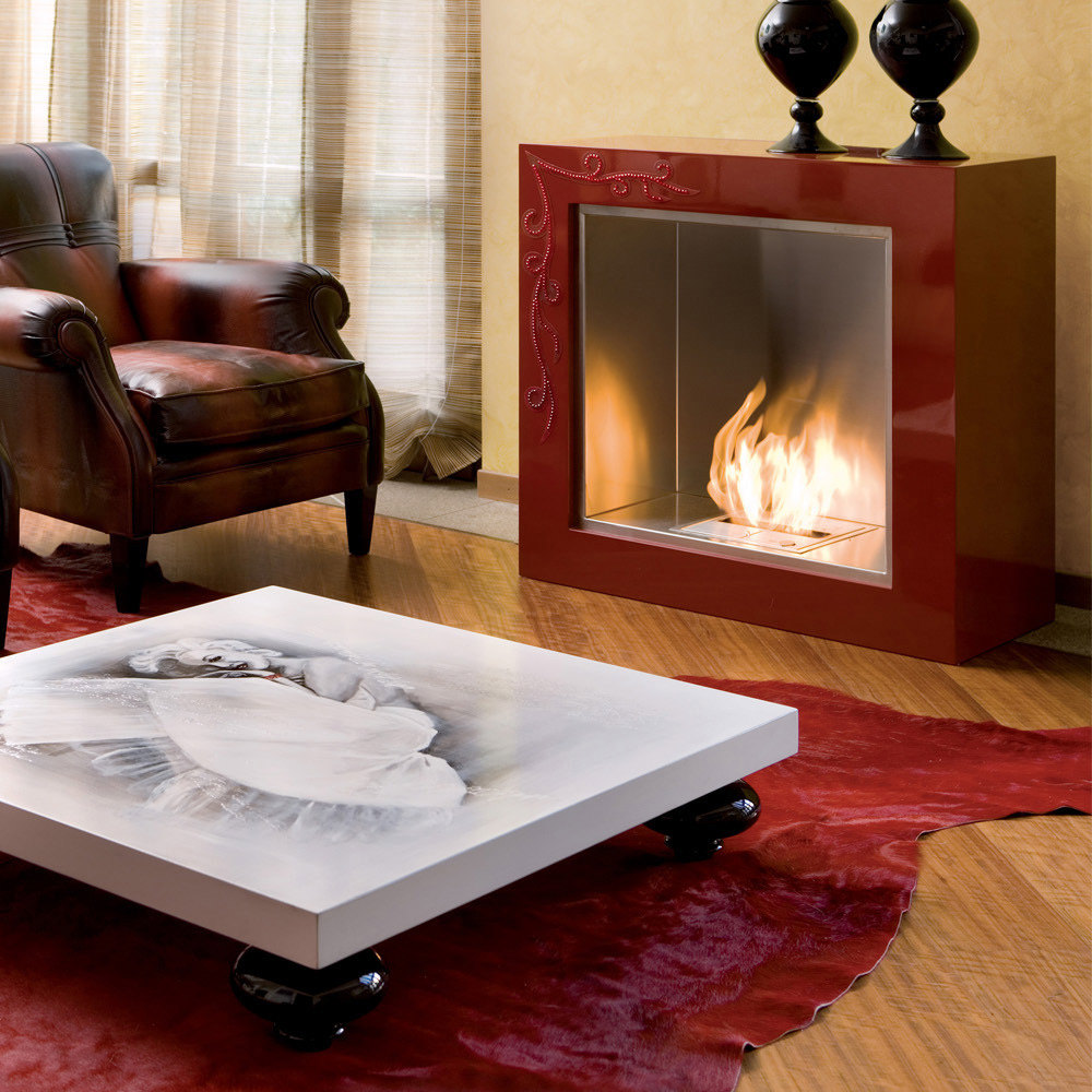 自立式の家具型暖炉で、ステンレススティール製のファイアーボックスの内部に、EcoSmartバーナーを収容できるようになっています。