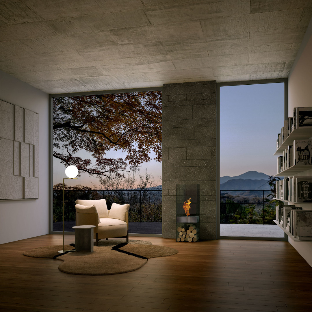 シースルー効果と反射性を備えたガラスパネルが魅力的な炎の姿を強調し、生活空間に暖かな雰囲気を醸し出します。どんな場所にもなじむと同時に、自由に移動させることができるので、さまざまなスペースに設置することができます。