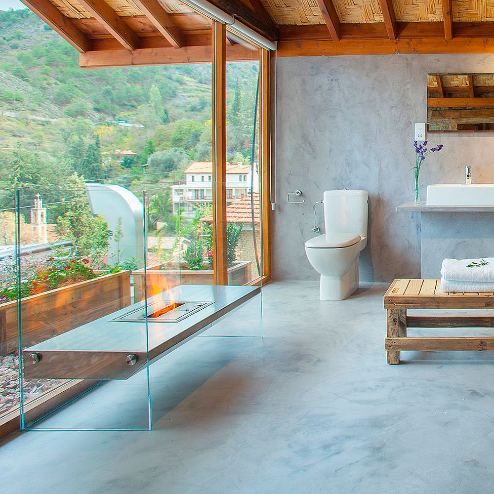 ステンレススティール製のベンチは、まるで浮いているように周囲のガラスに取り付けられています。ガラスパネルによって炎がさまざまな方向に反射し、炎が「踊っている」ように見えます。息をのむほど美しいセンターピースとして、独特な雰囲気と暖かさを生み出します。