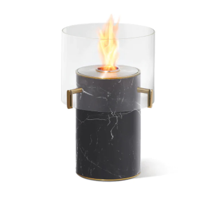 炎を囲む耐熱性の高いガラススクリーンを支えるアームとベースのリムには、木と大理石とも相性がよい真鍮がアクセントとなっています。