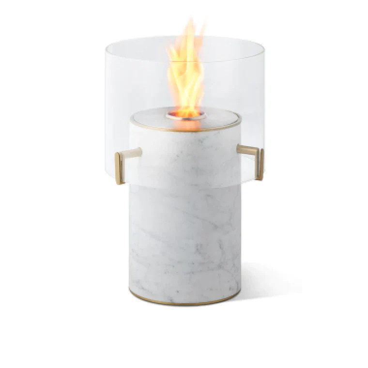 炎を囲む耐熱性の高いガラススクリーンを支えるアームとベースのリムには、木と大理石とも相性がよい真鍮がアクセントとなっています。