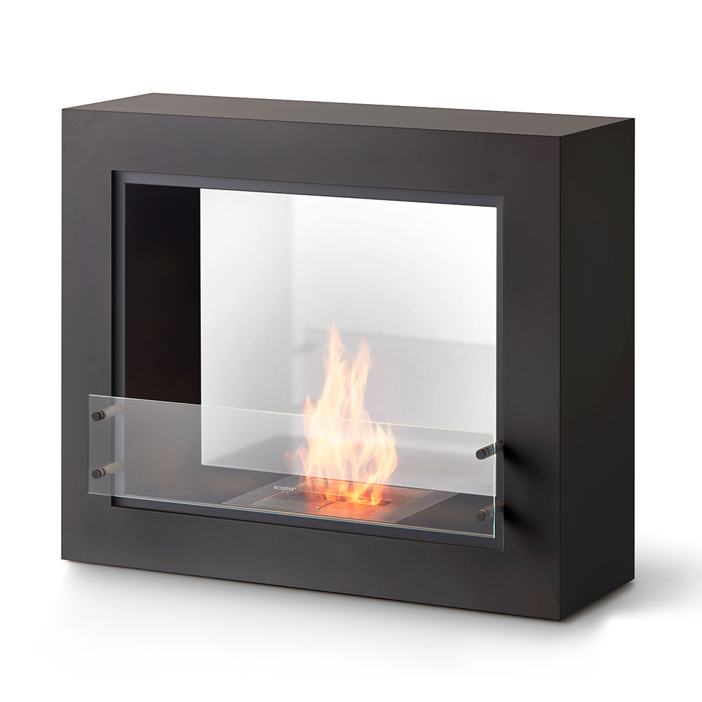 長方形の自立式二面開口型暖炉で、すっきりとしたモダンなラインが特徴です。後面には強化ガラスを使用し耐久性を高めています。