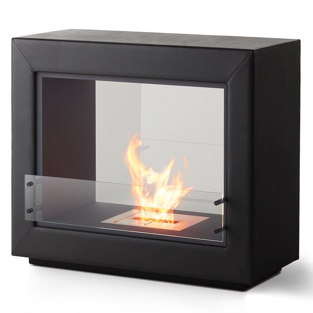 長方形の自立式二面開口型暖炉で、すっきりとしたモダンなラインが特徴です。後面には強化ガラスを使用し耐久性を高めています。