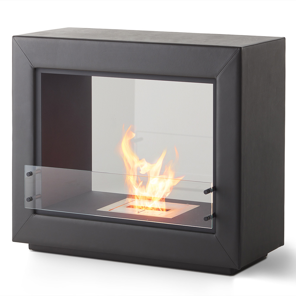 長方形の自立式二面開口型暖炉で、すっきりとしたモダンなラインが特徴です。後面には強化ガラスを使用し耐久性を高めています。