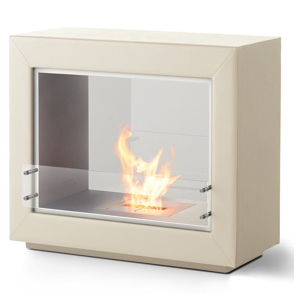 長方形の自立式二面開口型暖炉で、すっきりとしたモダンなラインが特徴です。後面には強化ガラスを使用し耐久性を高めています。