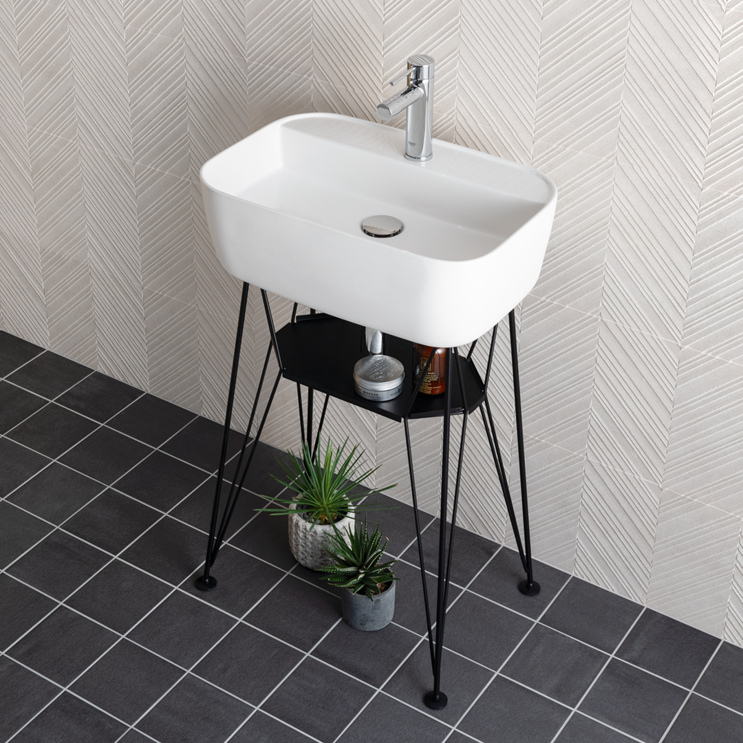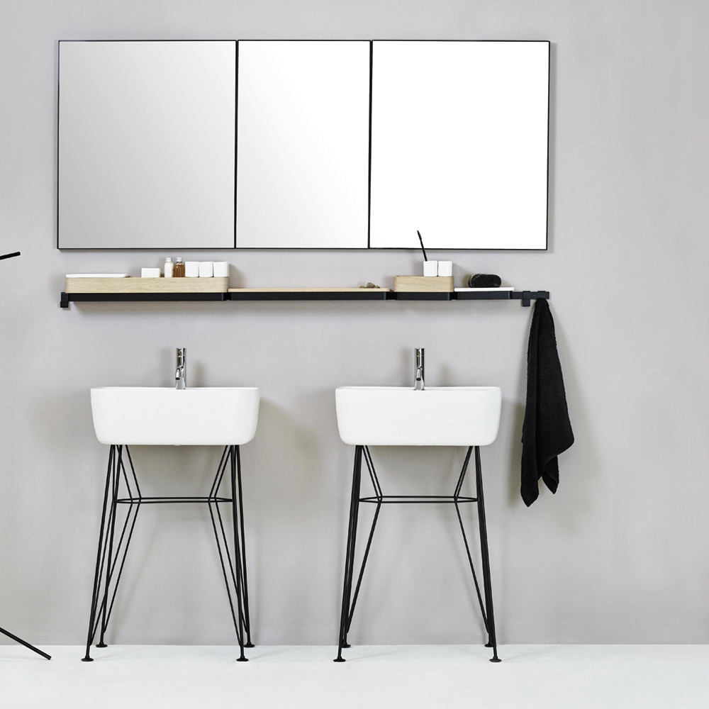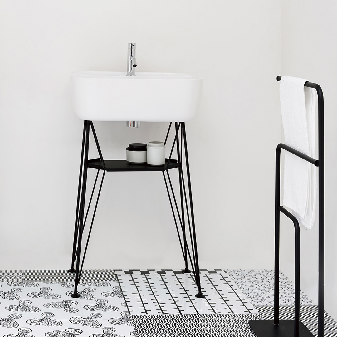 メタル製の脚部は、タオルレールとしても機能し、 狭いスペースでも有効に使う事ができます。