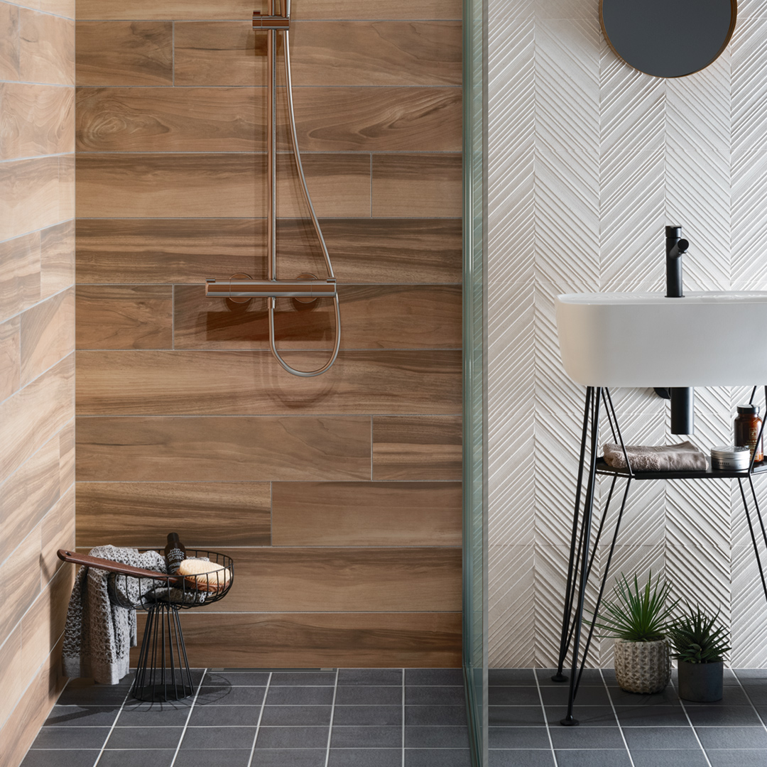 ファニチャー調のデザインは、バスルームにリビングルームの雰囲気を与えています。